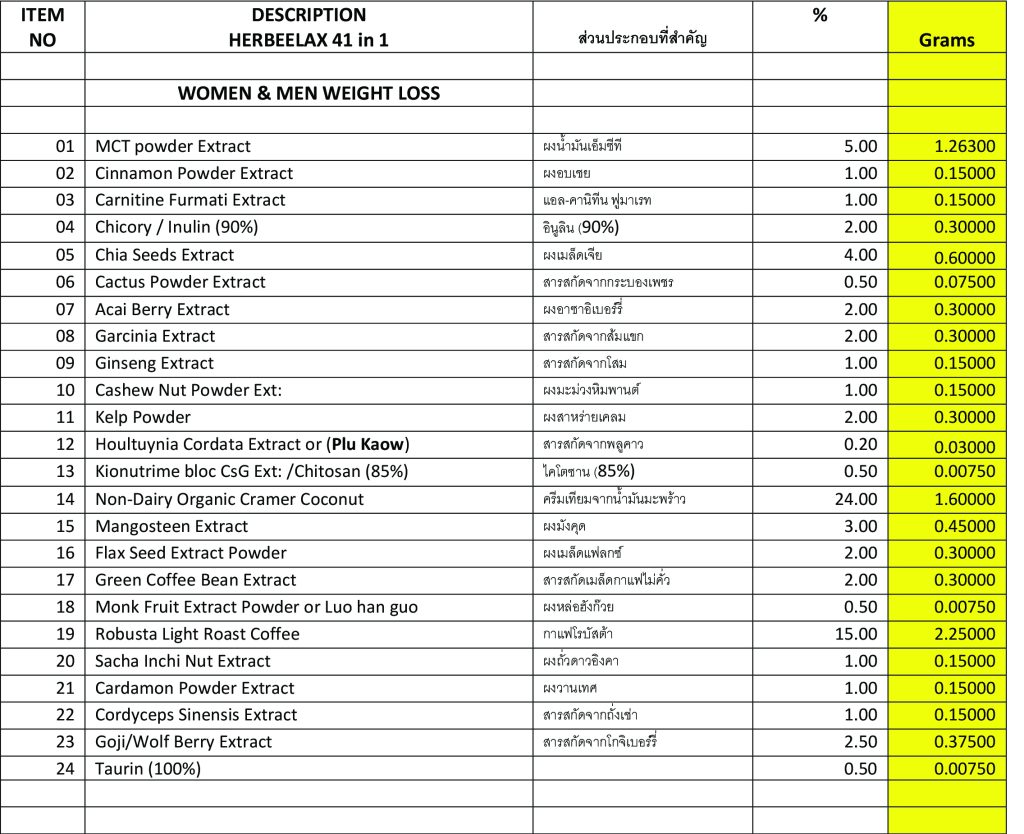 HerBeeLax coffee Mix 41 in 1 PLUS contain ingredients that, can help promote weight loss, lowers a bit appetite, burns fat, helps maintain a nice firm body etc.